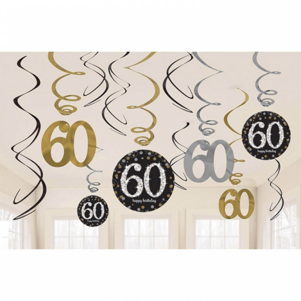 Vi har fundet års Fødselsdag Hænge Dekorationer Stk Sølv fra Festkassen hos festkassen i kategorien . Dekorer et festligt lokale til 60 års fødselsdagen. Dekorationerne er lige til at hænge op i loftet og består af 12 dele ialt. Fremstillet af metalfolie og pap i farverne sort, guld og sølv. Længde på spiralerne er 45 cm.
