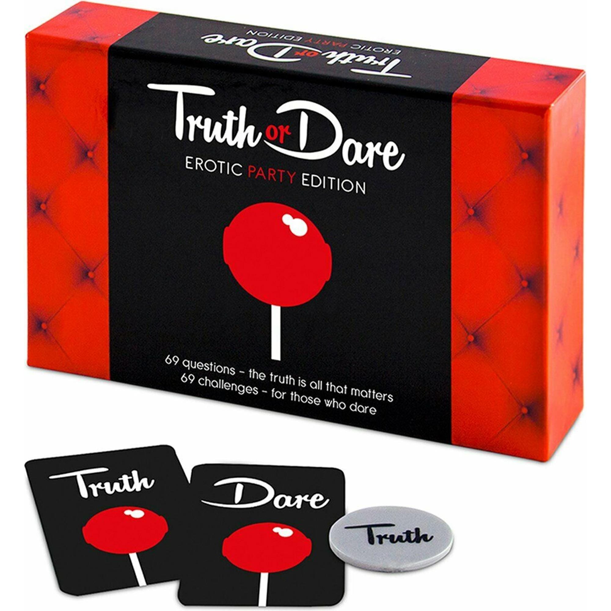 Vi har fundet Truth Dare Erotic Party Edition hos mshop i kategorien . Hvad gør den speciel Truth or Dare Erotic Party Edition er et festligt sexspil, som uden tvivl vil sætte gang i festen Truth or Dare Erotic Party Edition kan spilles af mindst 3 deltagere. Hver deltager står over for sandhed og udfordringer – og samle